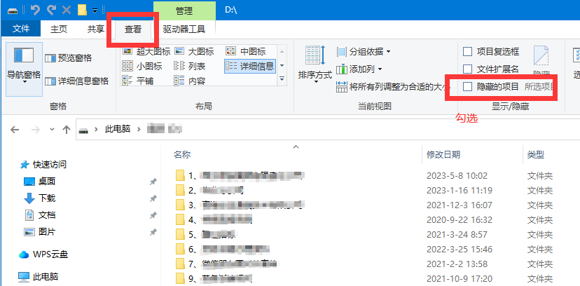 步骤二:点击【查看】-勾选【隐藏的项目】,就可以看见被隐藏的文件了。